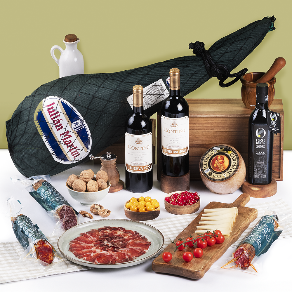 Una de nuestras composiciones más exitosas. Jamón de cebo de Campo y embutidos de fabricantes prestigiosos. Acompaña estos manjares con un queso puro de Oveja , aceite AOVEy vino CONTINO Reserva. Una combinación perfecta para disfrutar en cualquier ocasión.